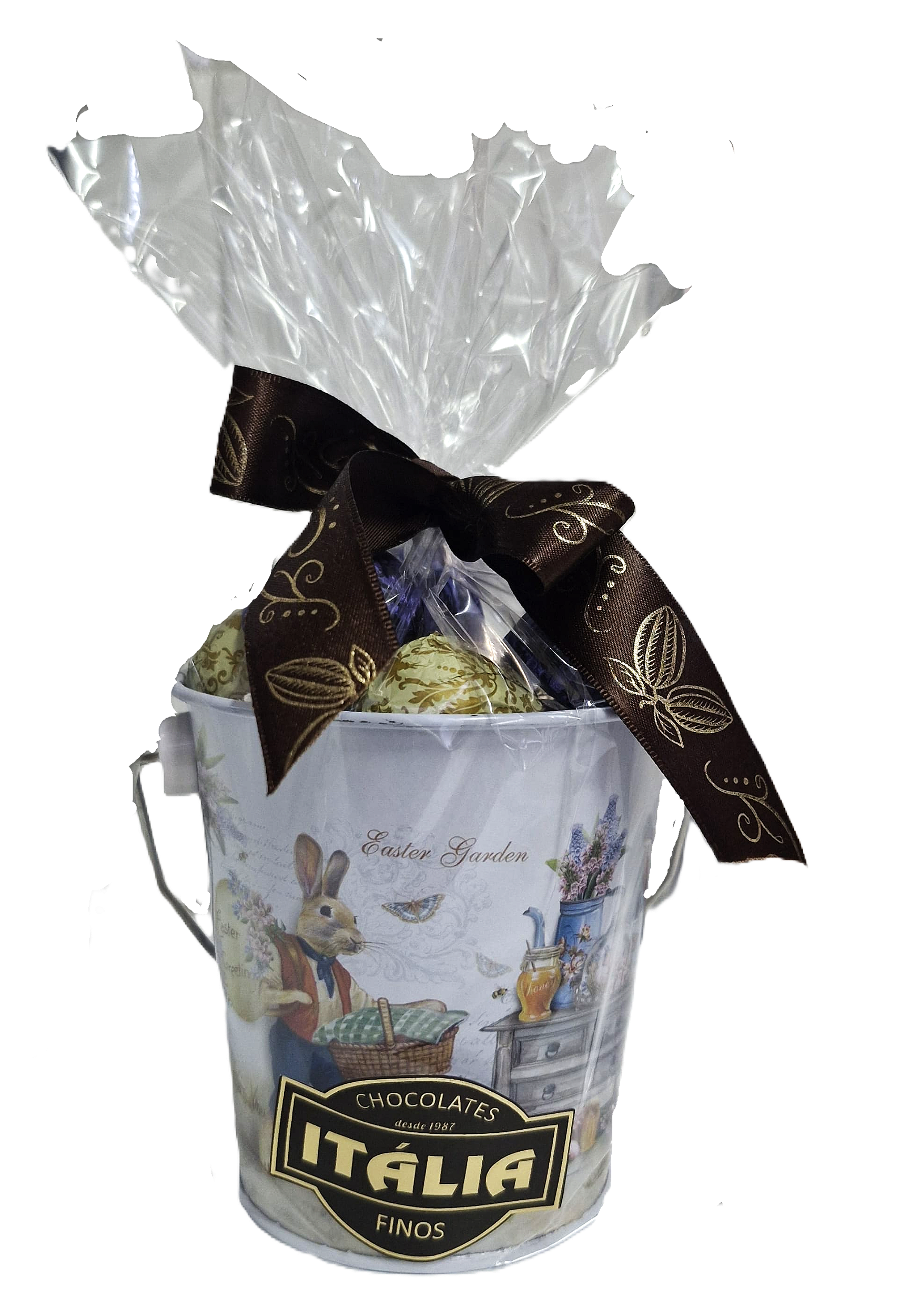 Cesto de Lata Coelho c/ 12 Bombons Truffados sabores sortidos. Aproximadamente 204 g.