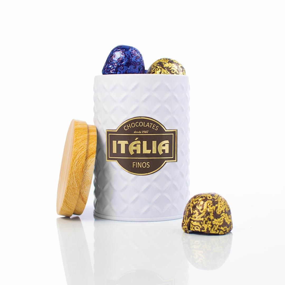 Lata Redonda Branca com 12 bombons truffados sortidos (truffado sabor chocolate branco, ao leite, amargo e avelã) com 204g.
